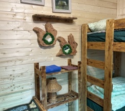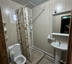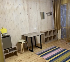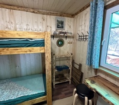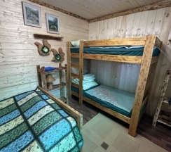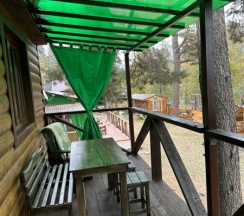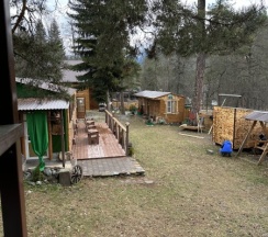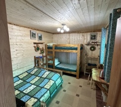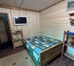 Домик (Берлога 1 и Берлога 2 ). Отдельно стоящий домик с верандой. На веранде стол с лавками. Домик с одной двухспальной кроватью и одной двухъярусной кроватью. В домике телевизор, небольшой холодильник, электрочайник. Постельное белье и полотенца для лица предоставляются. Банные полотенца по запросу. Санузел: душ, туалет, горячая вода бойлер 100л. Отопление электрическое. С веранды домика открывается красивый вид на горы. На территории базы: беседки, мангальные зоны, общая кухня с посудой и мангальными принадлежностями, детская площадка. Баня за допплату.