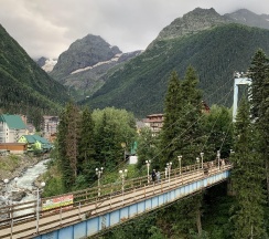 Расположение отеля, на мой взгляд, идеальное, в центре посёлка. Рядом и канатная дорога, и рынок, и река, и суперский вид из номера на горы (на фото).