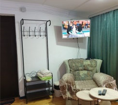 * В гостиной установлен большой телевизор со спутниковым телевидением.