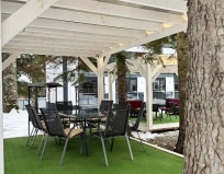Прекрасный, новый, чистый, современный отель. Брали двухкомнатный номер на 2 этаже, большой, удобный, две двухспальные кровати, диван, кресло, 2 телевизора (даже не включали), холодильник, душ, 2 балкона с видом на лес. Большая территория, отдельно стоящая кухня, места достаточно, стулья удобные, мягкие!