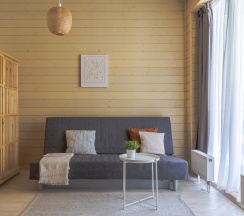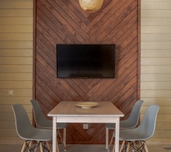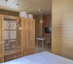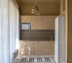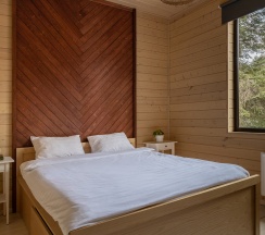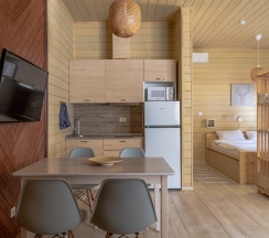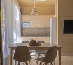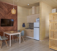 Комфортный домик площадью 30 кв. метров, идеально подходящий для семьи из 2 человек с 2 детьми (возможно максимальное размещение 3 взрослых и одного ребенка до 14 лет). Все домики оборудованы полноценными мини-кухнями, зонами барбекю и террасами для отдыха.