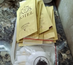 - косметические принадлежности : ( зубные щётки одноразовые в комплекте с пастой, ушные палочки, ватные диски, гель для мытья рук )