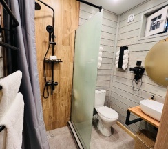 Уютные, тёплые, комфортабельные и стильные номера! Приветливый администратор, заболел ребёнок и она помогла с доставкой медикаментов. Красиво украшения территория, в номерах есть все необходимые удобства для проживания(мини-кухня, ванная, интернет, телевизор, микроволновка и тд.). Также есть баня!