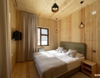 Прекрасное место. Новая гостиница, дерево. Древесный аромат в номере. Очень чисто, уютно, удобный матрас, подушки. Вид из окна шикарный! Есть кулеры, в номере тапочки, чай, чашки, туалетные принадлежности.