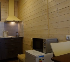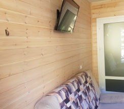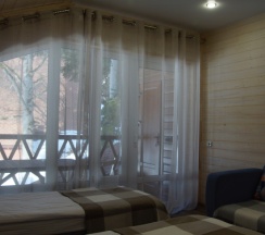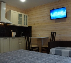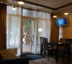 номер-студия площадью 20 кв.м. с витражными окнами с теневыми жалюзи, двумя мягкими диван-кровать для размещения семьи из двух взрослых и до двух детей. Номер расположен на первом этаже двухэтажного дома с отдельным входом с просторной террасы с завораживающим видом на рядом стоящую многовековую пихту и огромные горы. Отделка изготовлена из натурального дерева, окрашенного в белый тон. Поддержка температуры воздуха регулируется датчиками для Вашего уютного пребывания. Студия оснащена телевизором , полноценная кухня с посудой, стол, стулья, холодильник, чайник, индукционная плита, микроволновая печь, мультиварка, тостер. Просторный санузел с хорошей душевой со стеклянным ограждением с теплым полом, феном и всеми необходимыми гигиеническими принадлежностями.