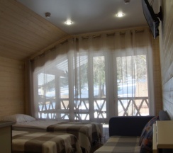 Улучшенный номер-студия площадью 25 кв.м. с дополнительной гардеробной комнатой для хранения вещей, с двумя раздельными кроватями с белоснежной постелью, дополнительное место небольшой диван-кровать для третьего места с витражными окнами, просторным крытым балконом, с отдельным выходом по теплой лестнице во внутренний двор и красивым видом на горы и лес. Номер расположен на втором этаже двухэтажного дома и сочетает в себе современный стиль и комфорт, отделкой из дерева в светлых цветовых гаммах и оснащенный всем необходимым. Поддержка температуры воздуха регулируется датчиками для Вашего уютного пребывания. Имеется телевизор, небольшая полноценная кухня с посудой, стол, стулья, холодильник, чайник, индукционная плита, микроволновая печь, мультиварка, тостер. Просторный санузел с хорошей душевой со стеклянным ограждением с теплым полом, феном и всеми необходимыми гигиеническими принадлежностями