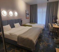 Отель новый, хайтэк, отличный номерной фонд - чисто, просторно, есть всё необходимое и даже больше. Большая кровать с двумя одеялами, классная сантехника, предметы гигиены, приветственный мини-бар в цене. Сотрудники милые, стараются. Не хватило шумоизоляции в номерах - слышно всё, что происходит в коридоре - детский плач, неугомонные звонки в соседние номера, хлопающие двери, топот сверху. Каждый день невольно слушали Аллегрову на полную катушку по поводу поздравления именинников (существуют ведь более современные и приятные тематические композиции!). Питание на 4 - типа домашняя еда, часто пресная, как в столовой, но разнообразие есть. В кафе а-ля карт готовят так же - пицца «пепперони» за 700₽ была приготовлена на постном тесте как галета, с салями и кетчупом - видимо, из того, что было. Расположение не особо удачное - вокруг идут стройки, в основные интересные места пешком идти либо вдоль дороги, либо по лесу и через стройку. Без машины не советую. На территории вроде бы всё есть для отдыха, но словно не очень уютно - на заборе сэкономили, много визуального шума. Есть немного тренажёров, детская площадка, мангалы и костровая чаша с креслами «кентукки», теннисный стол. И настолки в баре. Спа-комплекс относительно небольшой, но чистый и довольно комфортный - для посещения предоставляются халаты, тапочки, полотенца. Не хватило уборных и возможности облиться ледяной водой, помимо душа. Один раз сотрудник отеля налил химию из канистры в воду, когда в бассейне находились люди (и я, в том числе) - это недопустимо. И для меня не очень удобный график его работы - с 10 до 23 с перерывами в 13-15 и 18-19 (словно не для ранних пташек и ходоков в горы). В последние дни нашего отдыха отель уже был битком, поэтому нужно было успевать поплавать в непопулярные часы. Посетители без особых претензий - в основном, южане, многие с маленькими детьми (последнее нужно иметь в виду, если предпочитаете покой и тишину). В целом, неплохо отдохнули, но не идеально.