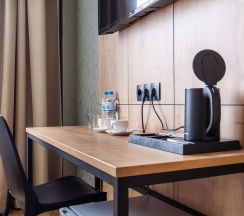 Однокомнатный номер площадью 18 кв.м, 2х местное размещение. Номера трансформируются с возможностью расстановки как раздельных так и общего спального места. Одна двуспальная кровать или две односпальные. Вид из окна на соседний отель