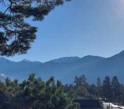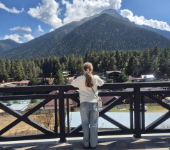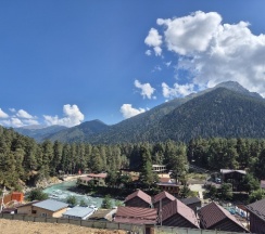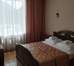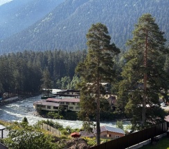 Замечательное расположение отеля - невероятный вид на горы, речку. Спали с открытым окном под ее шум - ВОСТОРГ!При этом расположен он в самый центр поселка-рядом магазины, кафе, аптеки... Нет проблем с парковкой.