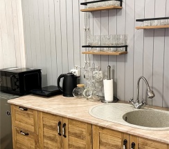 Кухня оборудована плитой, электрическим чайником, микроволновой печью, холодильником, а также столовыми приборами, посудой, обеденным столом и стульями.