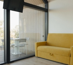 Были семьей, с 2 детьми, очень уютный домик - панарамные окна,большое спальное место на верху, комфортный диван, телевизор (мы брали с собой флешку с фильмом) кухня со всем необходимым,просторный и чистый санузел, хороший напор воды (для обладателей длинных волос это важно)