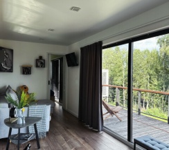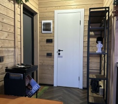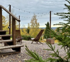 У домика имеется своя собственная терраса, мангальная зона (патио) с шезлонгами, костровой чашей для любителей погреться у костра и подсветкой из лофт гирлянды для более романтичного времяпровождения.
