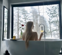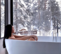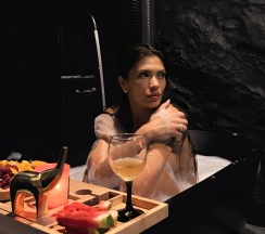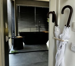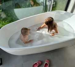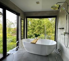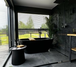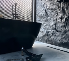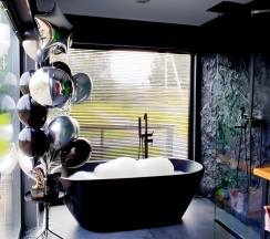 Домик с панорамной отдельно стоящей черной ванной, тропическим душем и гавайской черной скалой из арт бетона, над которой работала художник Анна В.