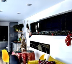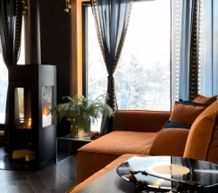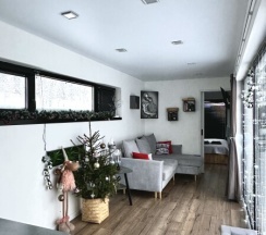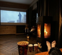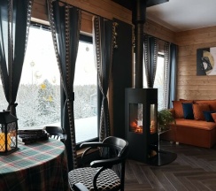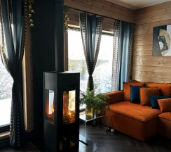 Камин с панорамным стеклом, посуда на 4 персоны, плита, духовой шкаф, холодильник, микроволновая печь, посудомоечная машина чайник, экран с электроприводом и проектором, раскладной диван.