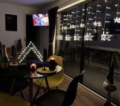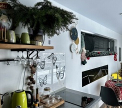 Кухня гостиная: посуда на 4 персоны, плита, холодильник, микроволновая печь, чайник, телевизор, кондиционер-обогреватель.