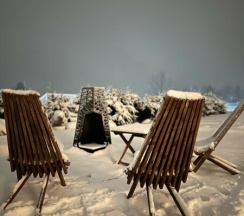 У домика имеется своя собственная терраса. Мангальная зона (патио) с шезлонгами и костровой чашей для любителей погреться у костра.