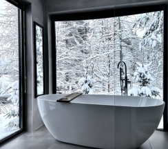 Домик с панорамной ванной комнатой исполненной в светло серых тонах в стиле лофт бетон.
