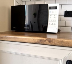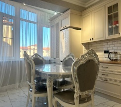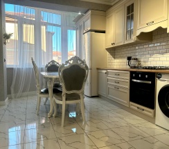 * Светлая и просторная кухня, оборудованная современной бытовой техникой: холодильник, электрический чайник, электрическая плита с духовкой, микроволновая печь, кофеварка и посудомоечная машина.