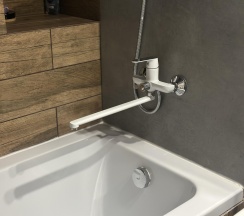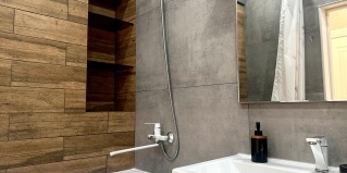 * В ванной комнате есть небольшая раковина, удобная ванна и ящики для хранения личных вещей.