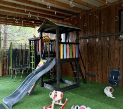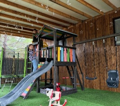 На территории оборудованная мангальная зона, несколько террас для посиделок, бар с холодными напитками и закусками, детский уголок с качелями и батутом. При нас устанавливался каркасный бассейн, увы не успели оценить по достоинству.