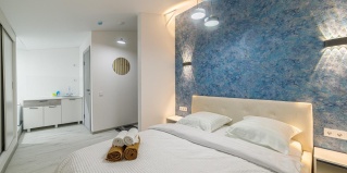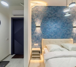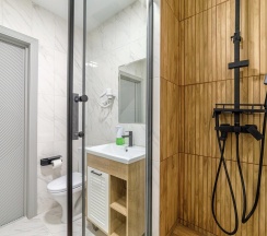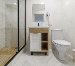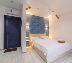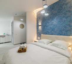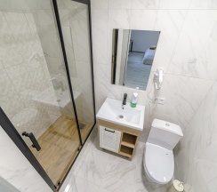 Номер подойдет для размещения 2 человек. Спальные места: 1 двуспальная кровать. Имеется собственная кухня с индукционной плитой, необходимой посудой и столовыми приборами. Для пользования доступны кондиционер, телевидение. Санузел с душевой кабиной. Постельное белье, полотенца и средства для гигиены предоставляются. В лобби отеля располагается кулер для горячей и холодной воды, микроволновая печь.