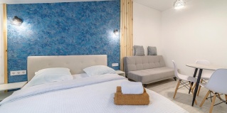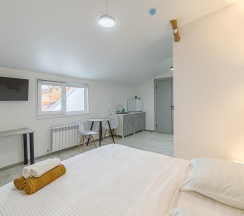 Номер подойдет для размещения 4 человек. Спальные места: 1 двуспальная кровать, 1 раскладной диван. Имеется собственная кухня с индукционной плитой, необходимой посудой и столовыми приборами. Для пользования доступны кондиционер, телевидение. Санузел с душевой кабиной. Постельное белье, полотенца и средства для гигиены предоставляются. В лобби отеля располагается кулер для горячей и холодной воды, микроволновая печь.