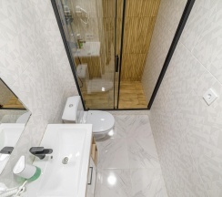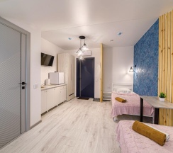 Номер подойдет для размещения 2 человек. Спальные места: 2 односпальные кровати. Имеется собственная кухня с индукционной плитой, необходимой посудой и столовыми приборами. Для пользования доступны кондиционер, телевидение. Санузел с душевой кабиной. Постельное белье, полотенца и средства для гигиены предоставляются. В лобби отеля располагается кулер для горячей и холодной воды, микроволновая печь.