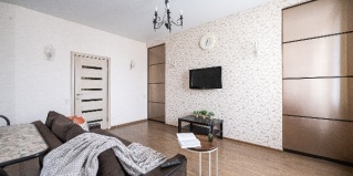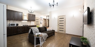 - Атмосфера гостиной насыщена комфортом и теплотой домашнего уюта. Безупречный диван при необходимости трансформируется в двуспальное место, которое обеспечит прекрасный отдых. Для досуга предусмотрен Wi-Fi, журнальный стол и настенный TV с множеством каналов разнообразной тематики.
