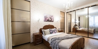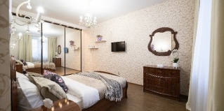 - Стильный интерьер спальни несет ощущение свежести и покоя. Красивая двуспальная кровать с ортопедическим матрасом позволит насладиться спокойным сном. Атмосферу уюта дополняют плотные портьеры и нестандартные настенные светильники. Для личных вещей предназначен комод и огромный встроенный шкаф-купе с зеркальными створками. Проведение нескучного досуга обеспечит кабельное телевидение и высокоскоростной Wi-Fi.