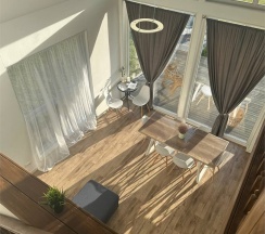 В ночное время предусмотрено 2 двухспальных спальных места ( кровать в изолированной комнате/диван в общей зоне)
