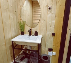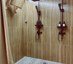 В этом доме, баня с можжевеловыми спилами, выложенными по дизайн проекту и панорамным окном, находиться прямо в самом доме, комфортный полноценный душ, вам не придется «мыться из тазиков»