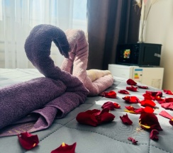 Неделю проживали в номере люкс, хотим выразить благодарность за такой хороший отдых! Номер просторный , уютный. В номере двуспальная кровать и диван, смело можно ехать с детьми 😊 Все удобства в номере, есть все необходимое. Администраторы очень вежливые и всегда готовы помочь. Спасибо большое, в следующий раз обязательно к вам!!!❤️❤️❤️!!!!!!