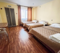 Комната подойдет для возможного размещения 4 человек. Спальные места: 1 двуспальная и 2 полуторные кровати. Имеются: санузел и душ, кондиционер, телевизор, стол, стулья, посуда и столовые приборы, чайник. Постельное белье, полотенца, одноразовые тапочки и средства гигиены для душа предоставляются. В общем доступе: микроволновая печь, холодильник.