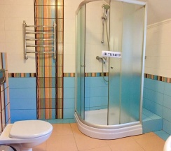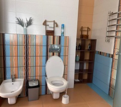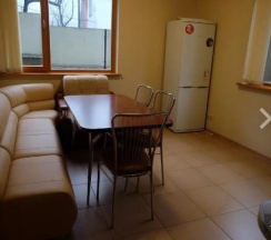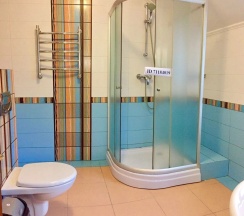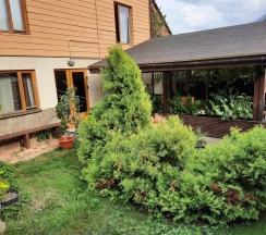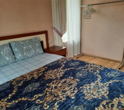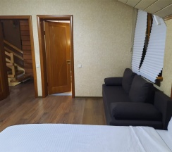 3хкомнатные апартаменты расположены на 1 этаже коттеджа с отдельным входом с улицы, могут полностью быть изолированы от других помещений. Площадь 75 кв.м. Две спальни (2хспальная кровать и две односпальные кровати, есть возможность поставить дополнительные места). Максимальное количество гостей 6 человек. Кухня-столовая площадью 15 кв.м оборудована всей необходимой мебелью и техникой для приготовления пищи и сбора семьи за большим столом. Холл 22 кв.м удобен для игр детей. Номер оборудован раздельными душем и санузлом. Перед апартаментами большая зеленая территория 80 кв.м, газон, терраса с удобными местами для отдыха, большая качель-кровать, которая понравится всем гостям. Есть собственный мангал и зона отдыха.