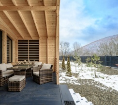Терраса имеет садовую мебель для шикарного отдыха на улице с боковыми проветриваемыми стенками, которые в случае необходимости закрываются автоматическими жалюзи