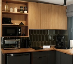 Отличный отель со множеством плюсов. Чистые, новые дома, со стильным интерьером, уютной территорией, продуманными деталями. Впервые встречаю в отеле наличие тостера и СВЧ-печи👍