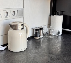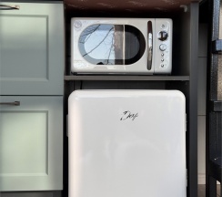 полностью оборудованная кухонная зона (холодильник, переносная плита, микроволновая печь, чайник, посуда необходимая для приготовления еды)