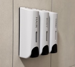 Совмещенный санузел с ванной комнатой: душевая, с/у, раковина для умывания, фен, косметика в диспенсерах.