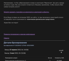 Отдыхали в санатории в июле 2025г. Благодарим за качественные медицинские услуги массажиста Садыхова Илью, медицинских работников бальнеологического отделения Лещенко Полину,Фролову Галину, Фанину Наталью. Отзывчивый и внимательный персонал.