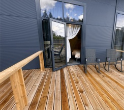 Современное и стильное оснащение номеров соответствует европейскими стандартами. В каждом номере есть электрокамин, установлен теплый пол. Панорамные окна с выходом на собственную террасу расширят пространство вашего отдыха, а затемняющие шторы, позволят выспаться в комфорте и прохладе. На территории комплекса есть мангальные зоны. Отличный сервис и радушие персонала гостиницы, оставят самые положительные эмоции.