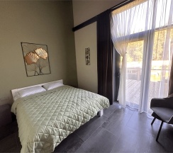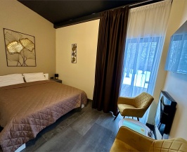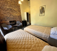 Номер стандарт с электрокамином, расположен выходом на внутренний двор гостиницы, имеет собственную приватную террасу и мангальную зону. В нем комфортно проводить время вдвоем, (двуспальная кровать, на две кровати не разбирается) находится вблизи купели фурако и бани.