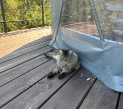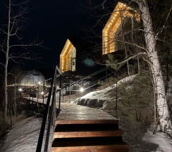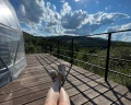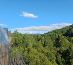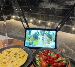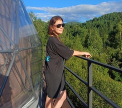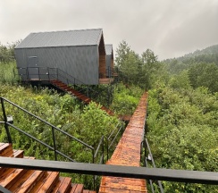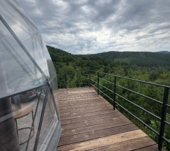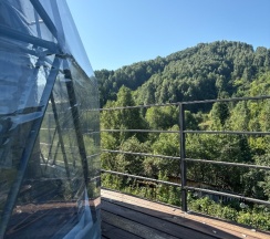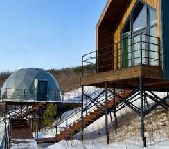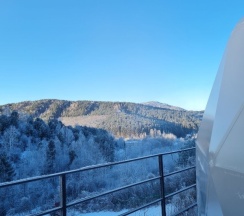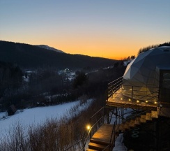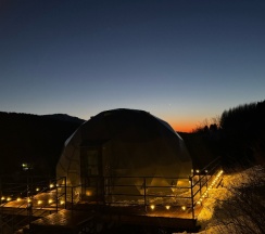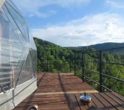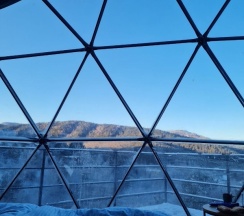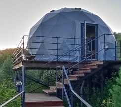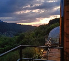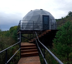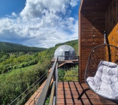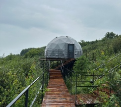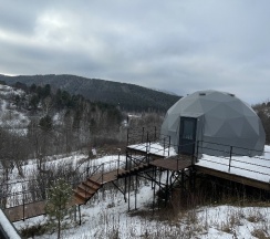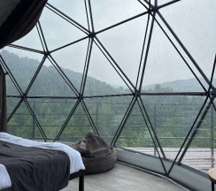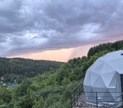 Очень красивое место. Поднимаешься на высоту и видно все горы, максимально приближено к природе. В домике-куполе уютно, стильно, красиво, приятно отдыхать. Даже дождь не помешал нашему отдыху. В домике все есть, посуда, свч, хороший душ, тепло. Администратор очень приятная женщина, вежливая. В дорогу нам дали очень вкусный зелёный чай. Рядом с домиками ходит приятный котик майнкун, очень добрый. Рядом с домиками есть стульчик, приятно можно пообедать на природе с чудесным видом. Еще есть зона барбекю. В общем у нас остались только приятные впечатления. Рекомендую 👍
