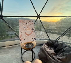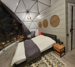 Это место поражает воображение и заставило меня заплакать от счастья. Тишина, горы, огромное панорамное окно в сфере выходит на закат. Когда идёт дождь - ощущение что я внутри музыки для медитации. До курортной зоны ехать на яндекс такси 8 минут за 150р, правда ждать пока назначится в среднем минут 10. Сюда доставляют еду. В номере есть чайник, посуда, холодильник, кондер и на охлаждение и на нагревание ночью. В санузле душ, полотенца. Так же хозяева сами делают офигенный собственный чай. На территории есть мангальная зона. Мы отдыхали 5 дней, и остались в полном восторге. Спасибо, что вы есть ❤️🙏❤️