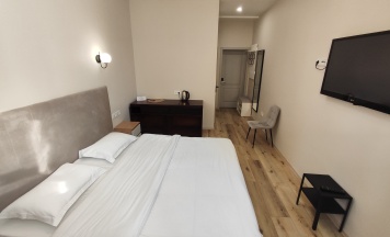 Большой просторный номер с двуспальной кроватью и небольшим диваном. В номере стол, тумбы ,ТВ