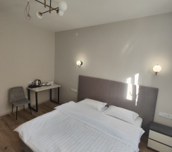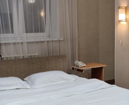 Номер просторный с 2 спальной кроватью. В номере стол, тумбы.