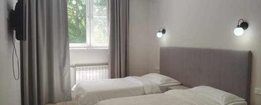 В номере 2 раздельные кровати или одна большая 180х200,. вешалка для одежды, стол, ТВ, чайник, посуда