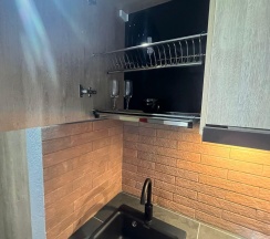 Апартаменты для 2 гостей представляют собой уютное и современное пространство, идеально подходящее для семейного отдыха или встречи с друзьями. В интерьере гармонично сочетаются элегантные линии и минималистичный дизайн лофт. Спальная зона: уютная двуспальная кровать с качественным матрасом и мягкими подушками. Постельное белье из натуральных тканей приятных оттенков. Кухня: полностью оборудованная кухня с современной техникой (холодильник, плита, микроволновка, электрический чайник). Набор посуды и столовых приборов для приготовления и приема пищи, удобный стол. Ванная комната: современные сантехнические устройства, душевая кабина, бойлер, фен, зеркало. Мягкие полотенца и набор средств гигиены. Дополнительные удобства: гладильные принадлежности, бесплатный Wi-Fi, телевизор с плоским экраном, вместительный шкаф.