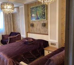 Двухкомнатные апартаменты с дизайнерским ремонтом и красивым видом на горы. Спальные места: 1 односпальная кровать, 2 двуспальных кровати, 1 диван-кровать.