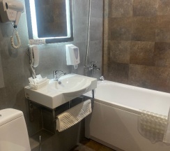 Шикарный номер за такую цену. Пока ехали к гостинице, за 5 мин забронировали номер за 3600, а если регистрируется там же, то ещё скидка вышла, итого 3400. Мы проехали десятки гостиниц за время путешествий, понятно по трассе отели вообще жесть, и отели в городе всегда лучше. Объективно в этом все прекрасно, не к чему придраться! Чисто. Нет запахов от ковролина и вообще. Шторы блекаут, белоснежная ванна ❤️, рабочая хорошая сантехника, идеально чистый унитаз, фен, мыло, зуб паста с щеткой, бритва, шампунь, полотенца по 2 и для ног (что тоже плюс), тапки одноразовые, холодильник, чайник, бутылочка воды, чай, кофе, сахар, чашки, бокалы 3 вида. Светильники у каждого, смарт-телевизор, столик, два стула, все современное. Про постель думаю и так ясно, все достойно. Все что и должно быть собственно и понятно за что заплатил. Просто настолько все было плохо в других "отелях", что такие как сказка) Утром открыла окно , а оно идеально чистое, да вы душки ❤️ а, и завтрак на выбор!