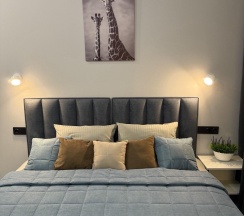 Удобства: Двухспальная кровать с ортопедическим матрасом (1,8 на 2 метра), кондиционер, Smart TV, Wi-Fi, рабочий стол, а также кухонная зона: (чайник, микроволновка, холодильник), полотенца, мягкий халат, ванна.